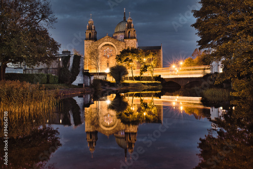 Obraz premium Galway cathedral by the Corrib River at night with reflection in water in...