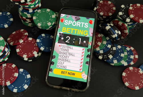 © Angelov, Obraz premium Gambling online casino Internet betting concept green screen. smartphone with poker chips, dice. Jackpot, casino chips.