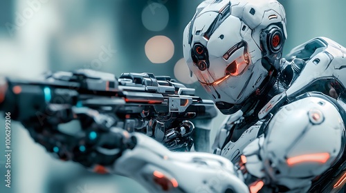 © Tonadech, Fototapeta premium Game figure wearing futuristic armor holding a detailed weapon in standing pose