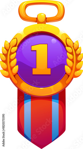 Naklejka premium Game medal award icon, victory and achievement trophy with number one, golden laurel wreath and red blue ribbon. Cartoon vector gold rank badge, game asset, representing success or competition victory
