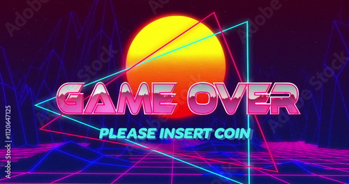 Fototapeta premium Game Over text and please insert coin over retro neon grid and sunset image