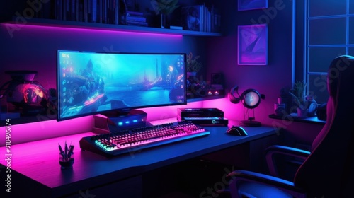 © paukan, Fototapeta premium Gaming Setup with Neon Lights