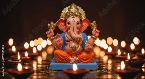 © Liton Khan, Fototapeta premium Ganesha idol surrounded by glowing diyas