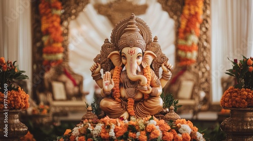 © Matcha_09, Fototapeta premium Ganesha idol with a backdrop of a traditional Indian wedding