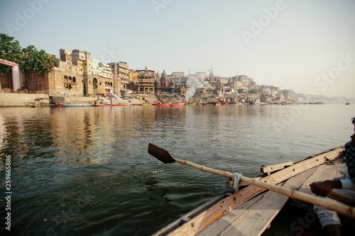 Obraz premium Ganga river and Varanasi ghats morning view with buildings from river and...