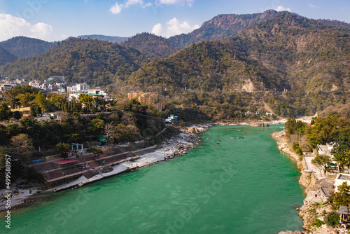 © explorewithinfo, Naklejka premium ganges river flowing through mountains with city nestled at riverbank from top angle