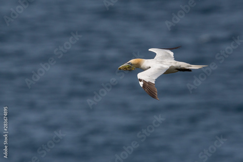 Fototapeta premium gannet (morus bassanus) in flight with nesting material in beak