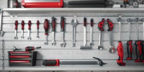 Fototapeta premium Garage showcasing hyperrealistic tools in a meticulously organized display....