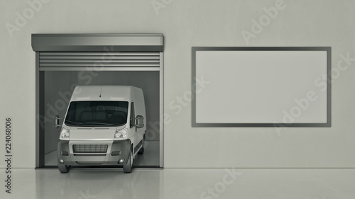 © lchumpitaz, Obraz premium Garage with Opened Roller Door. 3D Rendering
