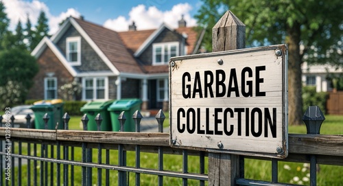 © Erlinda, Obraz premium Garbage collection lettering on sign at fence with house background
