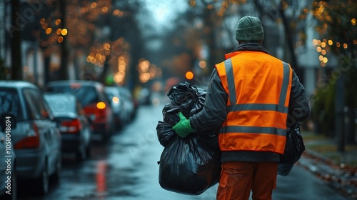 © Dreamy Shots, Fototapeta premium Garbage collector in reflective vest holding trash bags, early morning street scene, waste management, urban cleaning, public service, hardworking job, community, autumn leaves