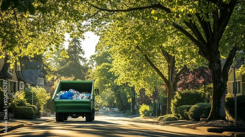 © utaem2022, Obraz premium Garbage truck picking up trash in residential neighborhood on sunny summer morning