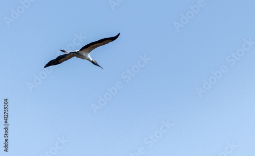 © Elehi, Fototapeta premium Garceta volando en un cielo azul claro