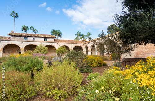 Fototapeta premium Garden and cart in San Juan Capistrano mission