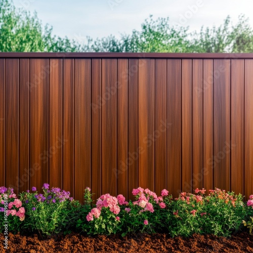© Photo18@desing, Fototapeta premium Garden Flowers Bloom Against Wooden Fence, Backyard , Landscaping