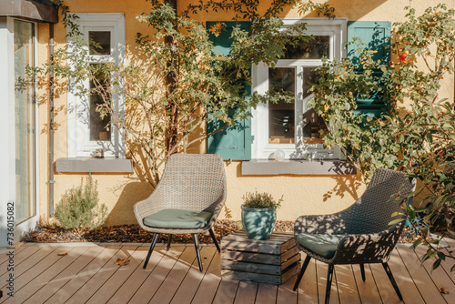 Fototapeta premium Garden Furniture For Leisure Time In Nature. Empty Chairs And Table Table In...