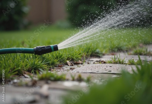 Naklejka premium Garden hose left running on patchy grass, creating a refreshing scene