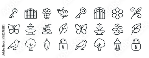 Naklejka premium Garden icons: keys, gates, flowers, butterflies, trees, birds, lanterns, locks
