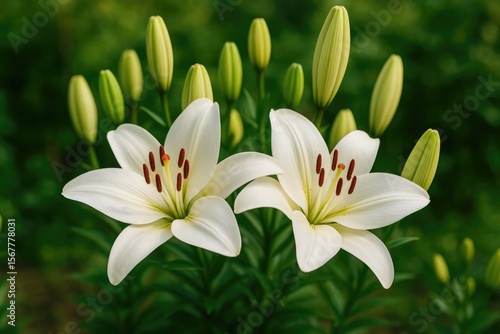 Fototapeta premium Garden scene featuring two white lily blossoms with multiple buds
