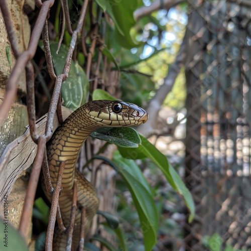 © Waleed, Naklejka premium garden snake slithering through fence gap into surbor