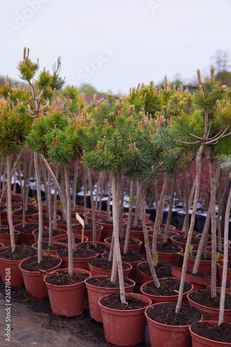 Fototapeta premium Garden store center with many of young coniferous trees. The nursery of plant and trees for gardening