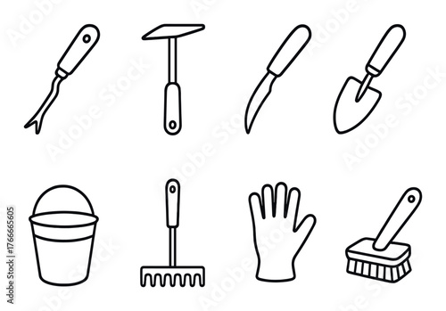 © Hanna, Fototapeta premium Garden tools silhouette set on dark background