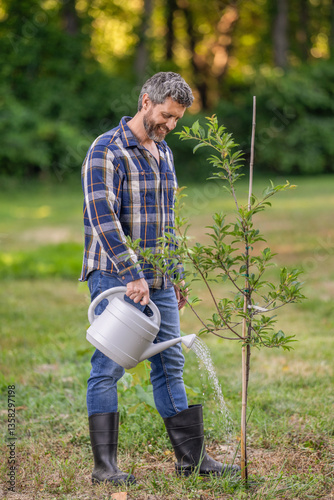Fototapeta premium Gardener in spring. Man with watering can in garden. Watering peach tree. Planting a tree. Gardening and watering orchard. Seedling for planting tree. Gardener man gardening. Earth day