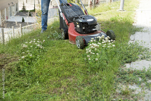 Fototapeta premium Gardener mowing lawn with lawn mover.