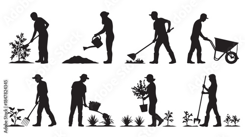 © Hamid, Obraz premium Gardener Silhouettes in Various Gardening Activities with Simple Black Illustrations on White Background for Agriculture and Horticulture