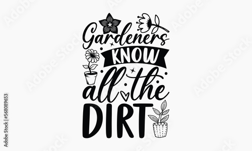 Fototapeta premium Gardeners Know All The Dirt - Gardening T-shirt Design, Hand drawn lettering phrase, Handmade calligraphy vector illustration, svg for Cutting Machine, Silhouette Cameo, Cricut.