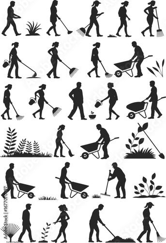 Obraz premium Gardening and landscaping silhouettes, raking, digging, wheelbarrow, planting, watering, garden tools, horticulture, agriculture, outdoor work, plant care, maintenance, flat vector illustration