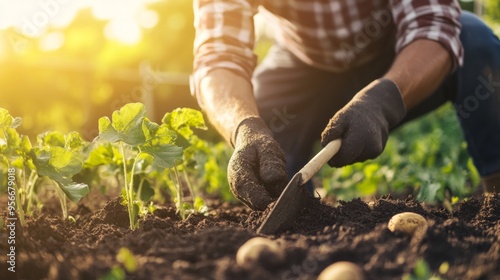 © Damerfie, Fototapeta premium Gardening at Sunset: Harvesting Potatoes