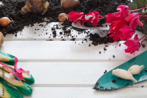 © Maya Kruchancova, Fototapeta premium gardening concept with flowers plant on white wooden background