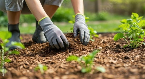 © Inkreatif, Fototapeta premium Gardening Hands Mulching Plants Spring Season