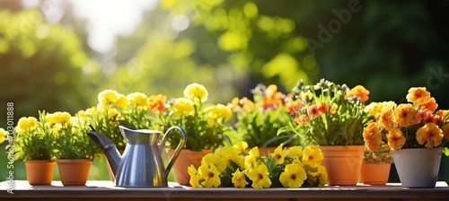 Fototapeta premium Gardening tools and flowerpots in a beautiful sunny garden essential...