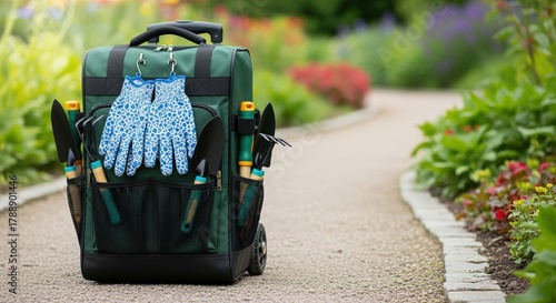Naklejka premium gardening tools backpack on garden path with vibrant flowers and colorful gloves