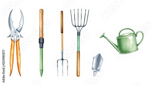 © Ahingska, Fototapeta premium Gardening Tools Watercolor Illustration of Trowel Fork Rake Pruners Watering Can