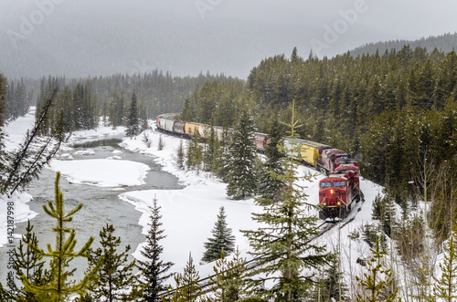 © alpegor, Obraz premium Gargo Train on Winding Track alongside the Bow River during a Heavy Snowfall. Banff National Park, Alberta, Canada