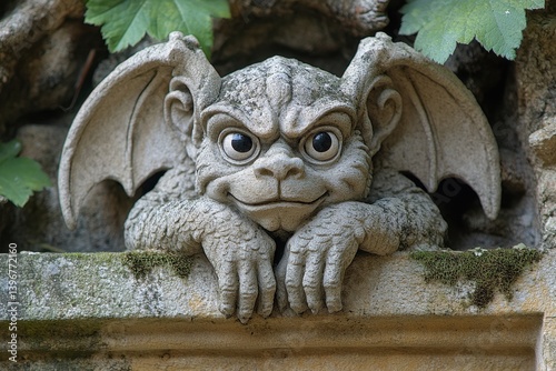 © Tanu, Obraz premium Gargoyle sculpture resting on stone ledge surrounded by greenery in a tranquil outdoor setting