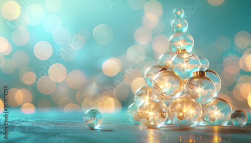 © Oleksiy, Fototapeta premium garland made from lot of glass transparent balls, inside the balls there are neon golden glowing lights, shape Christmas tree, festive blurred background