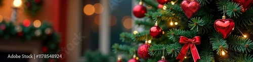 © Withun, Naklejka premium Garlands and red heart decorations on decorated Christmas tree, Garlands, Colorful