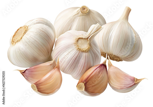 © Israt, Obraz premium Garlic bulbs and cloves arranged isolated on white background in closeup front view display
