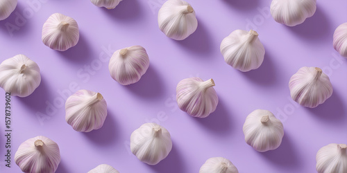 © Anastasia, Fototapeta premium Garlic bulbs on a colored background, colorful garlic pattern. Panoramic banner