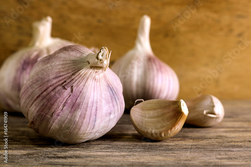 Obraz premium Garlic clove and garlic bulb on wooden background