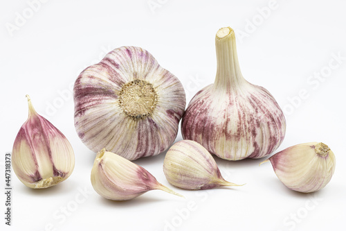 Obraz premium Garlic heads and cloves isolated on a white background.