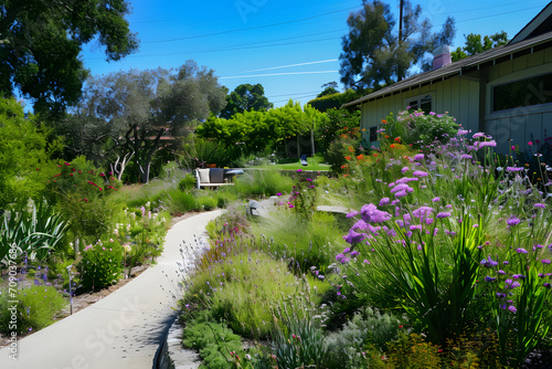 Fototapeta premium Gartenidylle: Eine harmonische Gartenlandschaft voller Blütenpracht und natürlicher Entspannung, eingefangen in einem bezaubernden Bild für Ihre Kreativprojekte