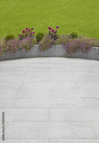 © Composer, Obraz premium Gartenterrasse mit Blumenbeet