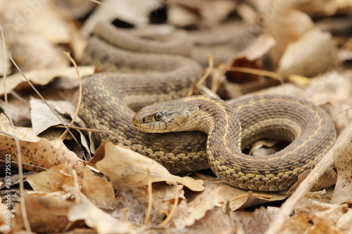 © Andrew, Fototapeta premium garter snake coiled up in leaf litter