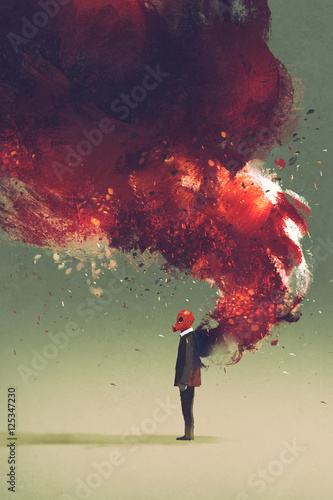© grandfailure, Fototapeta premium gas mask man standing with fire flame and smoke on his back,illustration painting