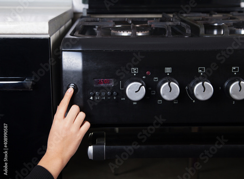Obraz premium Gas stove and woman in the kitchen.